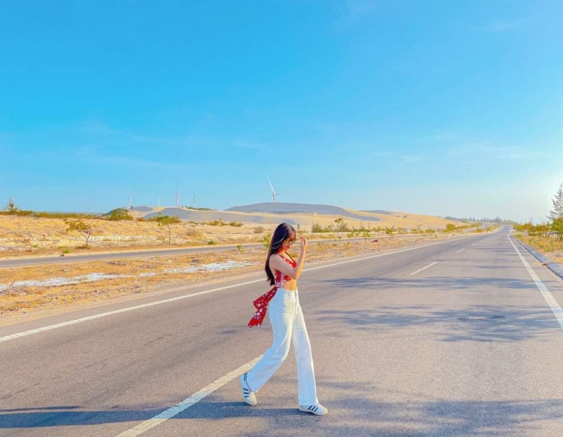 Giữa một không gian mênh mông đầy cát trắng và những hàng cây xanh, nơi đây lại xuất hiện những cánh quạt gió màu trắng khổng lồ đang quay chầm chậm dưới nền trời xanh khiến cánh đồng quạt gió ở Bình Thuận này vừa có nét thơ mộng của Bàu Trắng, lại vừa hiện đại và sang chảnh như ở trời Âu.