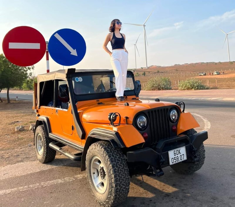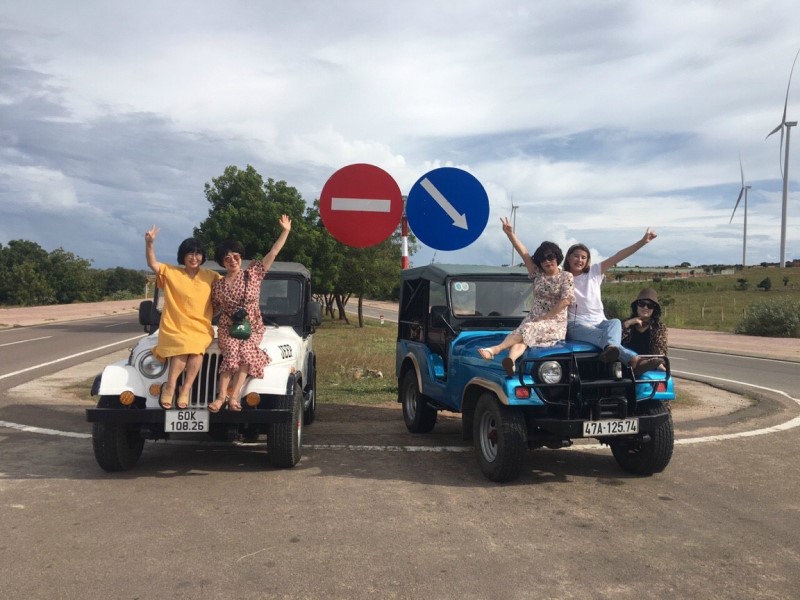 – Tạo dáng ngồi trên những chiếc xe Jeep màu sắc nổi bật bên cung đường biển cuốn hút.